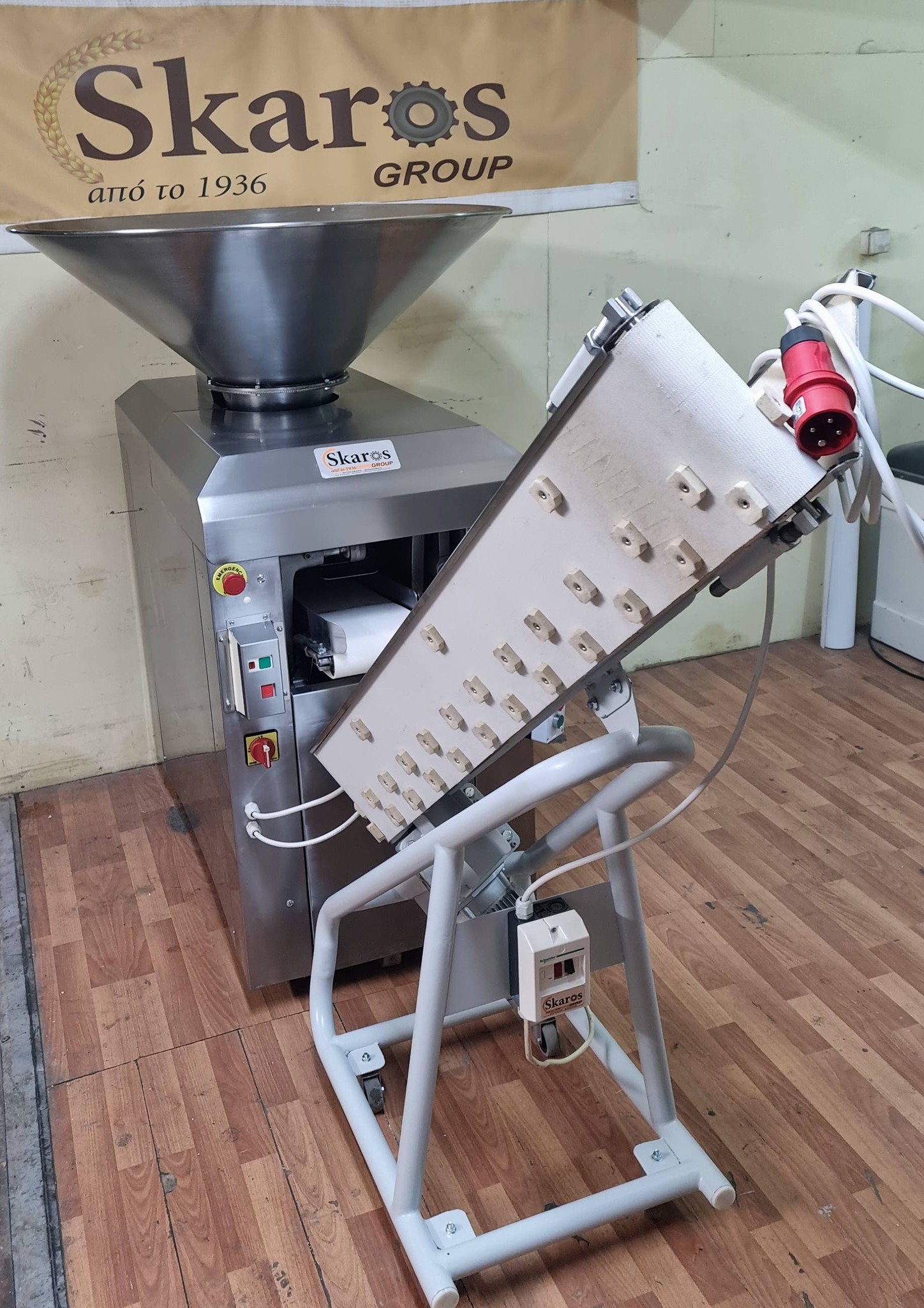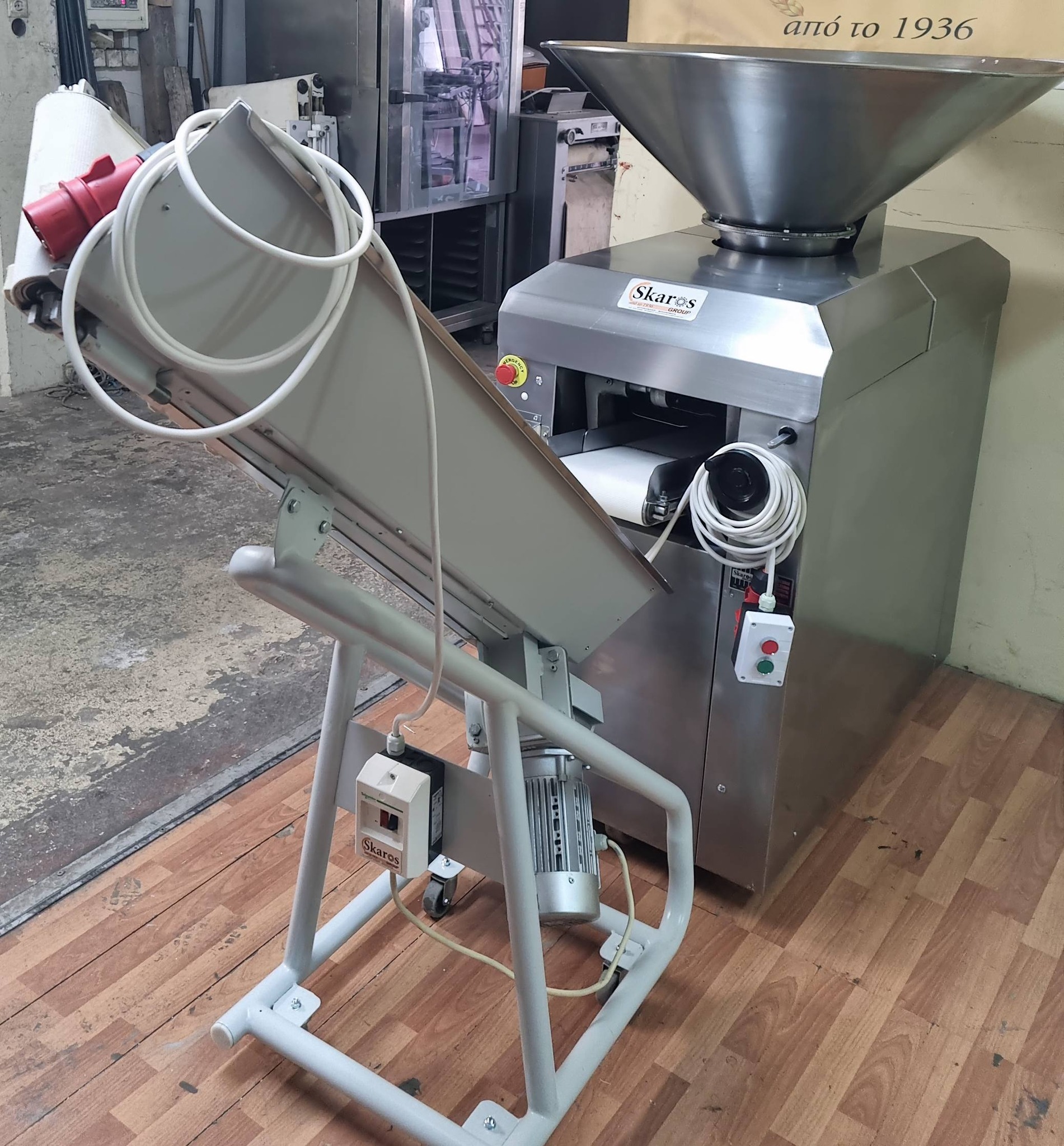 Μεταφορική ταινία(Αναβατοριο) δίνοντας την δυνατότητα να παραλαμβάνει τα τεμάχια απο την έξοδο του ζυγοκοπτικου και να στρογγυλοποιει μερικώς την ζύμη.